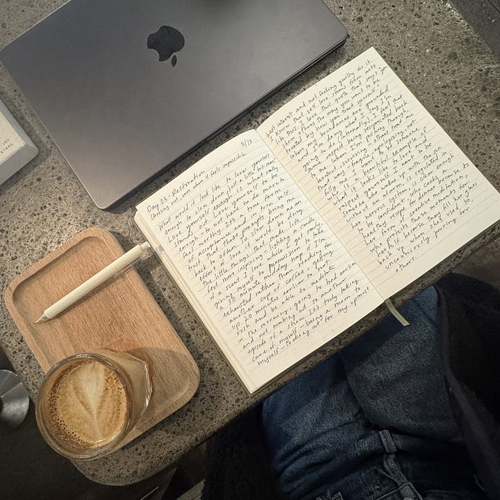 , our inspiring collaborator for this journey into restoration. Her perspective feels like fresh air for a cluttered mind. I love the way she invites us to stop believing the lie that we “don’t have time,” when the truth is, all we have is time — and how we choose to use it.• The essay she linked from her archive is playful, imaginative, and so distinctly Emmie. It reframes rest as something available in the in-between moments — like her idea of leaving one minute earlier and walking slower while telling yourself, “I’m not in a rush.” That line really stuck with me. It’s in those small, stolen moments that we begin to win back our peace.